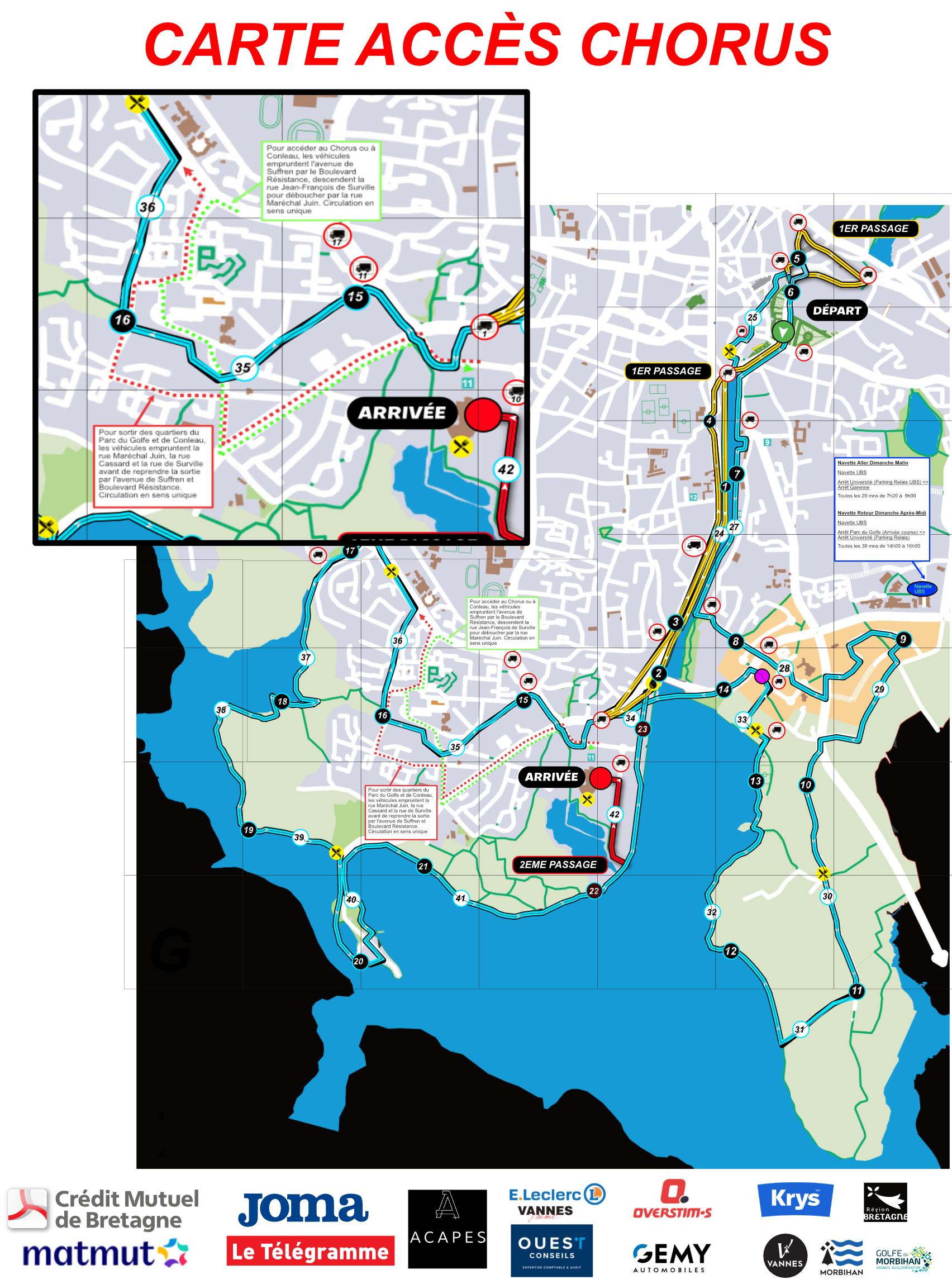 Fermeture de la rue Gilard à partir de 19h30, plus d'accès au parking devant le Chorus. La fermeture et la réouverture des voies se fera au fur et mesure du passage des coureurs et sous la responsabilité du directeur de course et des services de police. Toutes les voies débouchant sur le parcours sont déclarées sans issus durant le passage de la course et mises en double sens. Un accès sera maintenu par l’allée Caradec pour les clients des commerces de la rue Gahinet entre 19h30 et 19h45, sous la responsabilité de la police municipale au giratoire Jean Maurel et par les bénévoles à l’intersection Gilard/Gahinet